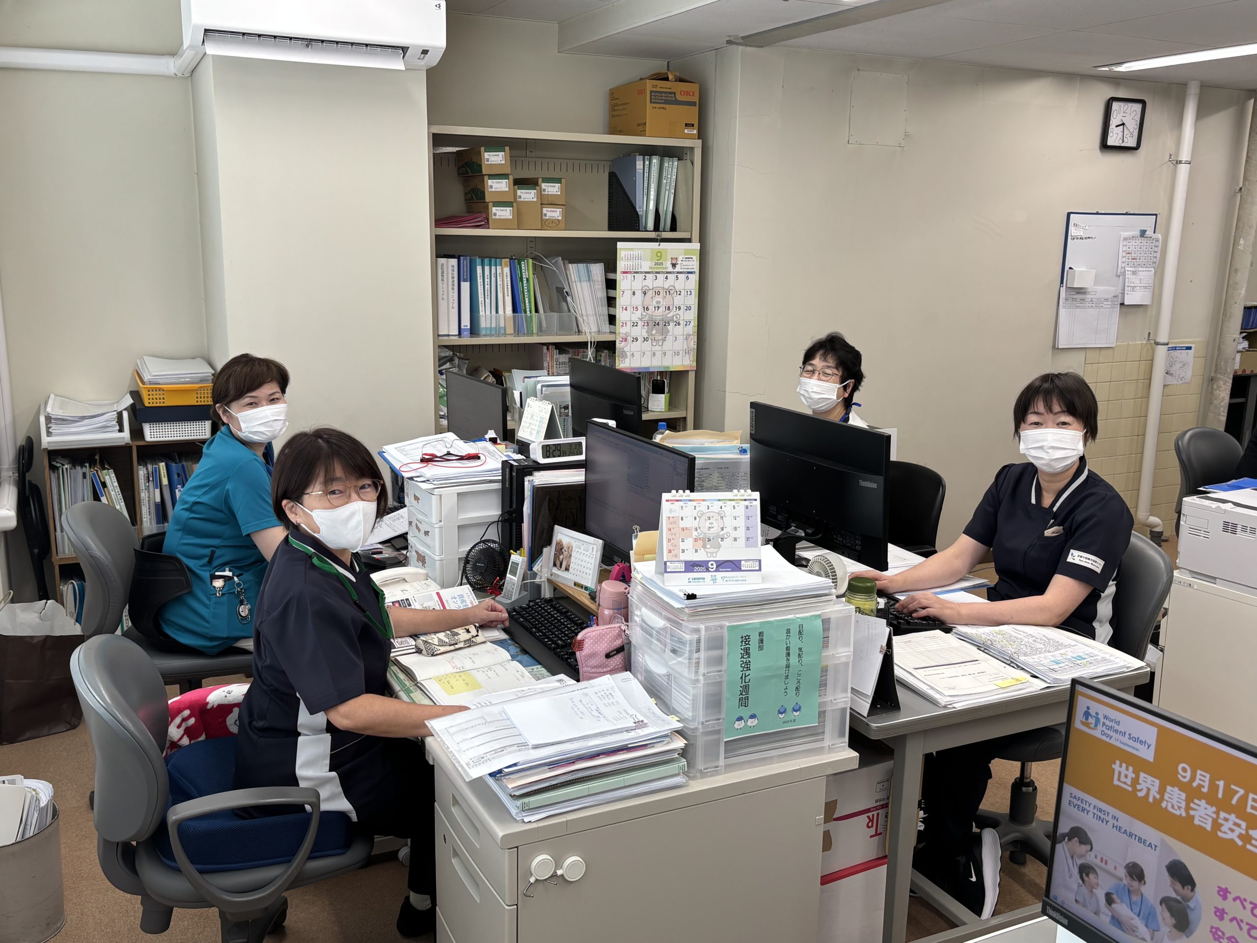 地域医療連携室は「病院の窓口」として、地域の医療機関や介護施設、在宅療養を支援する方々と密に連絡・連携を取る部署です。看護師、社会福祉士、事務職員で構成されており、部署内でも日々、多職種連携で業務を行っています。私たち看護師の主な業務は、入院された患者さんの退院支援・調整です。病棟ごとに担当が決まっており、主治医をはじめ、病棟看護師、セラピスト、薬剤師など院内の多職種と情報を共有しながら、退院に向けてサポートを進めていきます。何より、患者さんやご家族の思いを大切にし、退院後の療養を一緒に考え、実現できるよう支援しています。